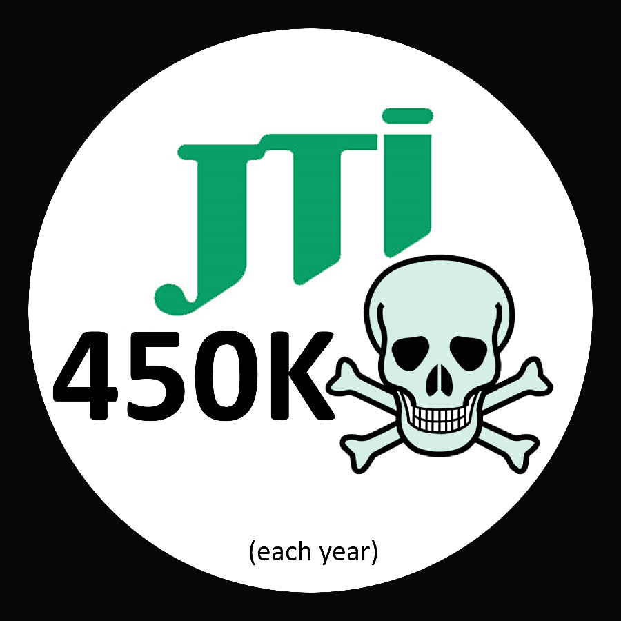 Il convient aussi de se rappeler que JTI n’est autre que l’ex-filiale internationale de la compagnie de tabac américaine R.J. Reynolds (RJR). Cette dernière a été reconnue coupable (en 2010) d’activités s’apparentant au crime organisé. C’est pour mettre sa filiale hors de portée des tribunaux nationaux que RJR l’a vendue à Japan Tobacco en 1999, lui permettant ainsi, sous un autre nom, de continuer sans être inquiétée des agissements considérés comme frauduleux aux USA. Par exemple, JTI est la seule multinationale du tabac qui persiste à nier la toxicité de la fumée passive.